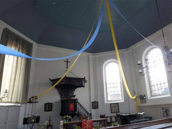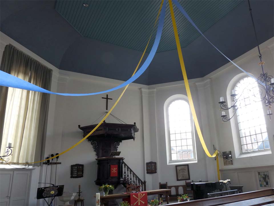 De kleuren van de kerk zijn hetzelfde gebleven. De muren dus ‘wit’ en het plafond hemelsblauw. Er werd voor de muren een bijzondere saus gebruikt met de naam ‘Thermo shield’ en deze verf kleurt en dekt niet alleen, maar zorgt ook voor isolatie en dat moet de stookkosten weer verminderen. Aan het plafond kwam ‘het oude’ ornament terug. Dit lag nog op zolder en is door gemeentelid Harm Kruit in zijn geheel gerestaureerd en is door de schilders onder handen genomen. Een hele klus, want de oude verf moest er van af worden gekrabd en vervolgens kreeg het ornament een gouden kleur.